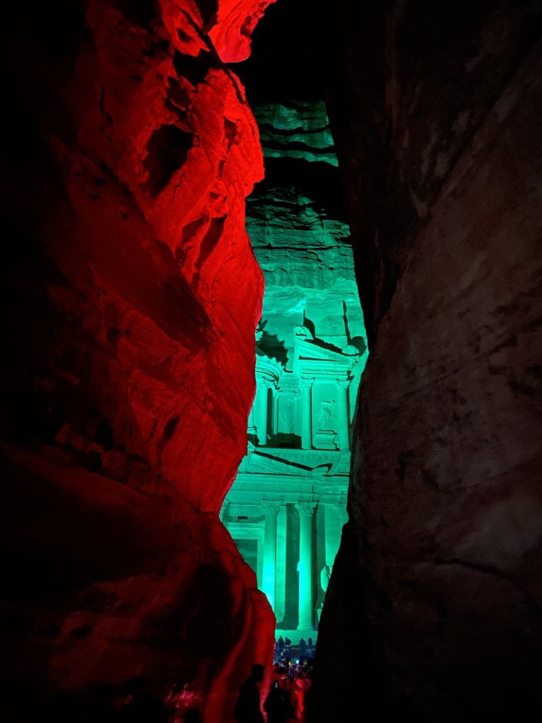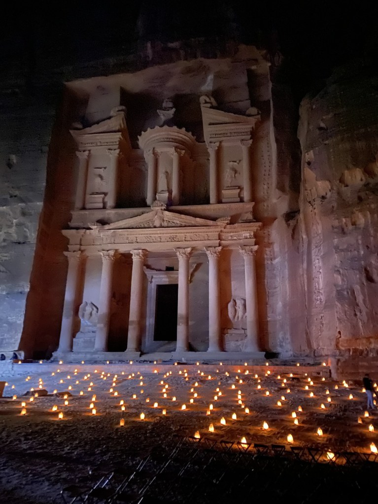 - Come on a Monday, Wednesday or Thursday to experience the Petra by night show. Its a lovely show with the iluminated canyon with candles, then the Treasure will be showing different colors under the sounds and voice of a local bedouin. It takes around 30 minutes and the ticket must be bought separately at the visitors centre for 17 JOD, together with a valid same day ticket. now the trick is do not leave Petra and come back later, stay at the Treasure area after 6.30pm, show your night ticket and then admire the emptiness of the place with very few other travellers and experience the iluminated Treasure by candles and with the lights test show… so amazing! You can have a simple but tasty bedouin dinner at the small bedouin café restaurant on the left for 12 JOD.